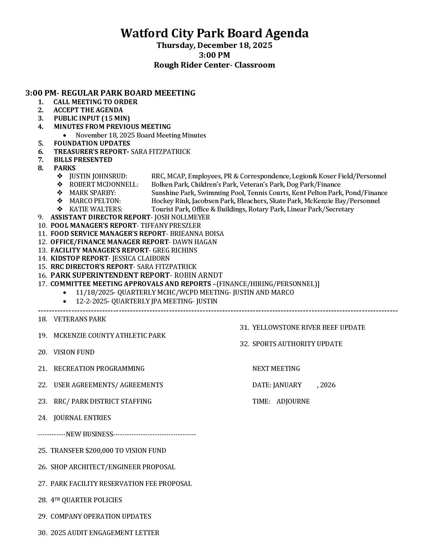 Next Watford City Park Board Meeting: January 13, 2025 at 3:00pmĀ